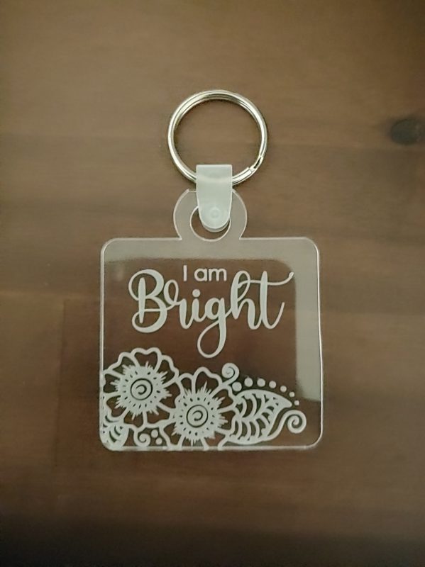 Single layer acrylic keychain in your choice of size, shape, and color. Comes with a plastic tab and key ring. Engraved on back side for clear and front side for colors. All edges are rounded for safety. I Am Bright floral design.
